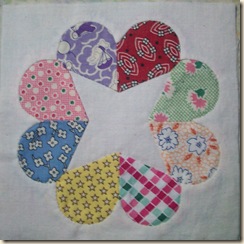 100_0452I will also post a picture of a block made with 30’s where every petal is a different fabric.  It is one of 2 blocks I made.  I kept this one and sent the other to a friend after I came up this way of doing Hannah Lou’s Hearts.  I think it is just adorable done with each petal a different fabric;  plus before I did the center star appliqué, I just laid the freezer paper template on one of the half square triangle blocks I had made, since I was making 2, I had one freezer paper template of the 4-pointed stars and 1 of the flower and it made the cutest Dresden Plate block.  Can you imagine it from seeing my block?